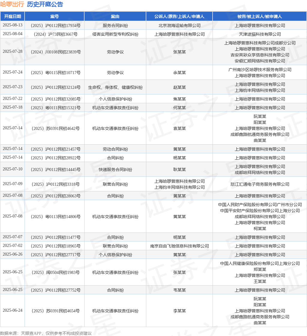 案号:(2024)辽0102民初27618号审理法院:沈阳市和平区人民法院案由:侵权责任纠纷当事人信息: 原告/上诉人:李某某 被告/被上诉人:安某某、上海哈啰普惠科技有限公司、中国大地财产保险股份有限公司河南分公司开庭日期:2025年6月17日根据统计,近一年内以上海哈啰普惠科技有限公司为当事人的历史开庭公告有281则,其中案由为“机动车交通事故责任纠纷”的公告以84则居首,其次为“合同纠纷”有42则,“生命权、身体权、健康权纠纷”有19则。历史开庭公告(前20条)如下: