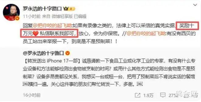 而且面对西贝老板的咄咄逼人,罗永浩也放了波大的,宣布悬赏10万,公开征集西贝使用预制菜的 “真凭实据”。摆明了就要是跟西贝死磕到底。