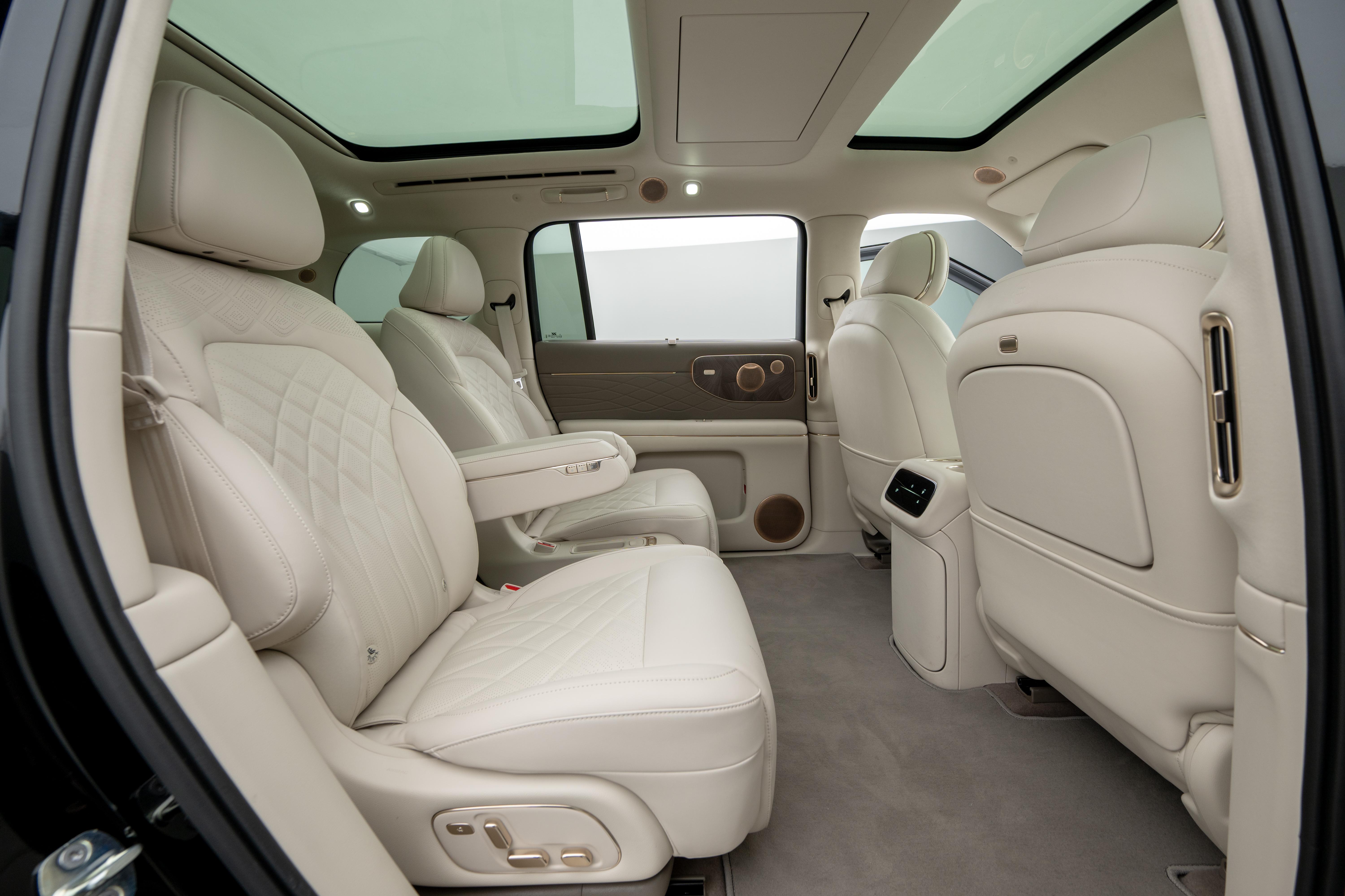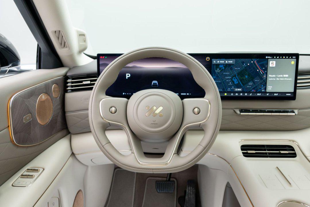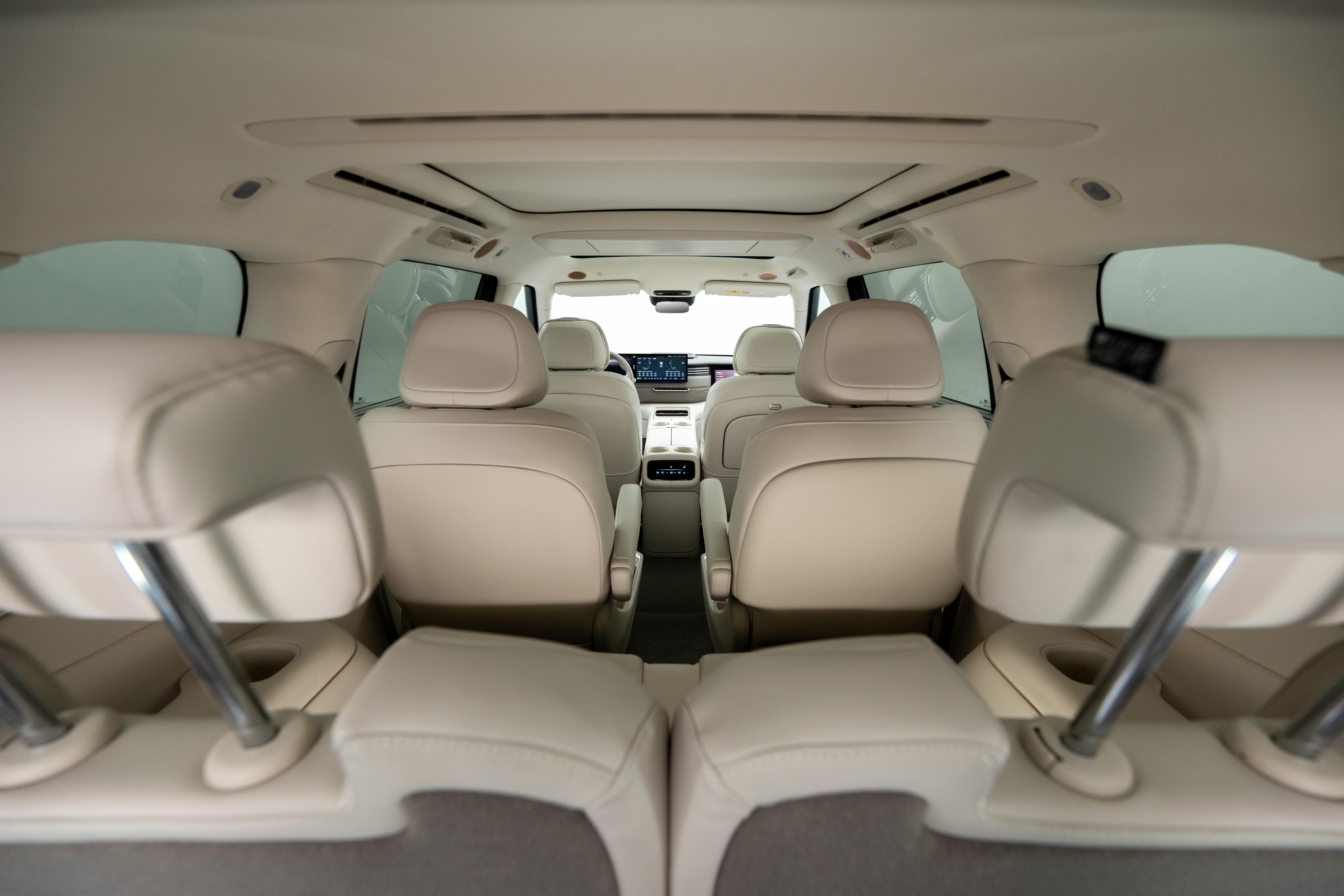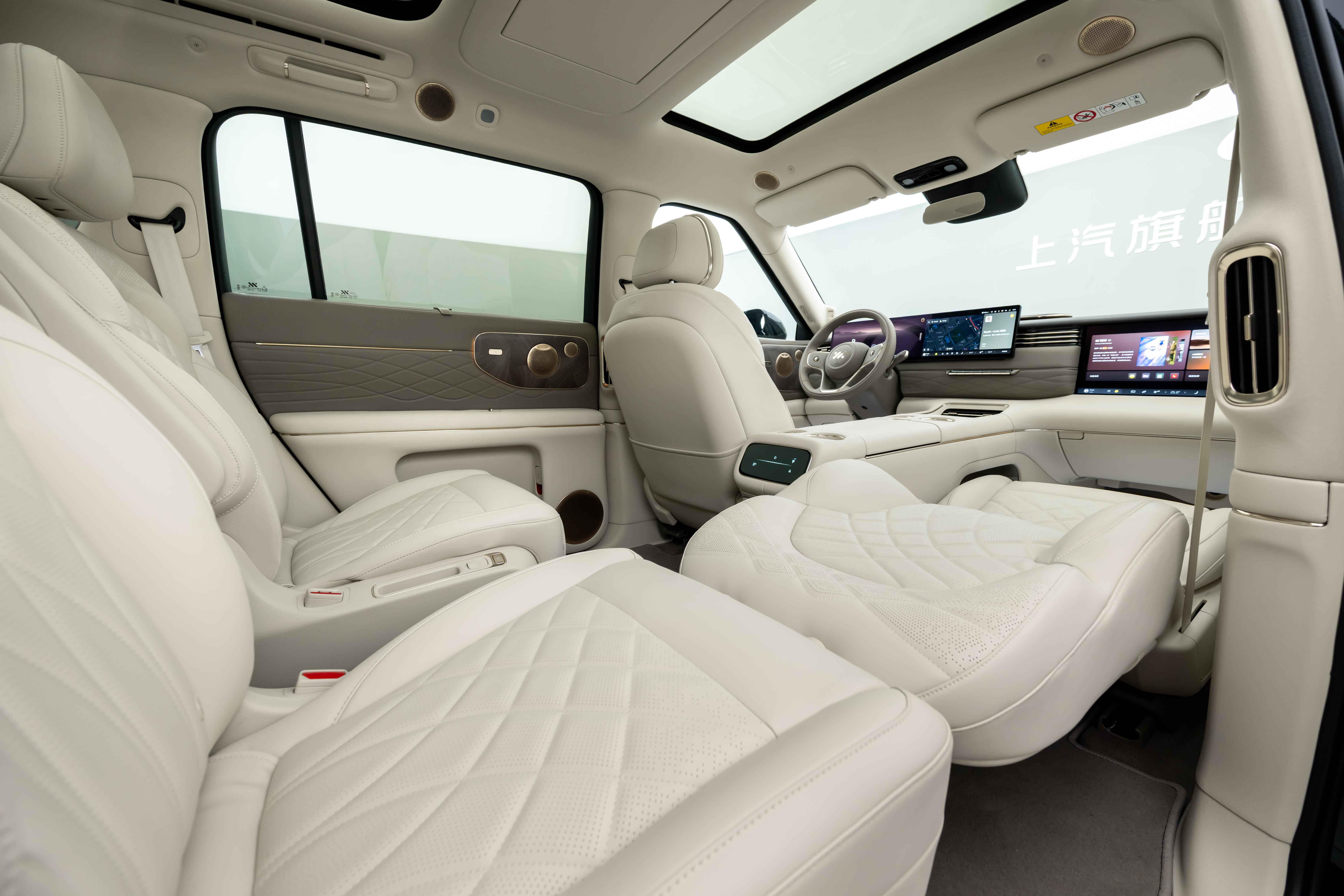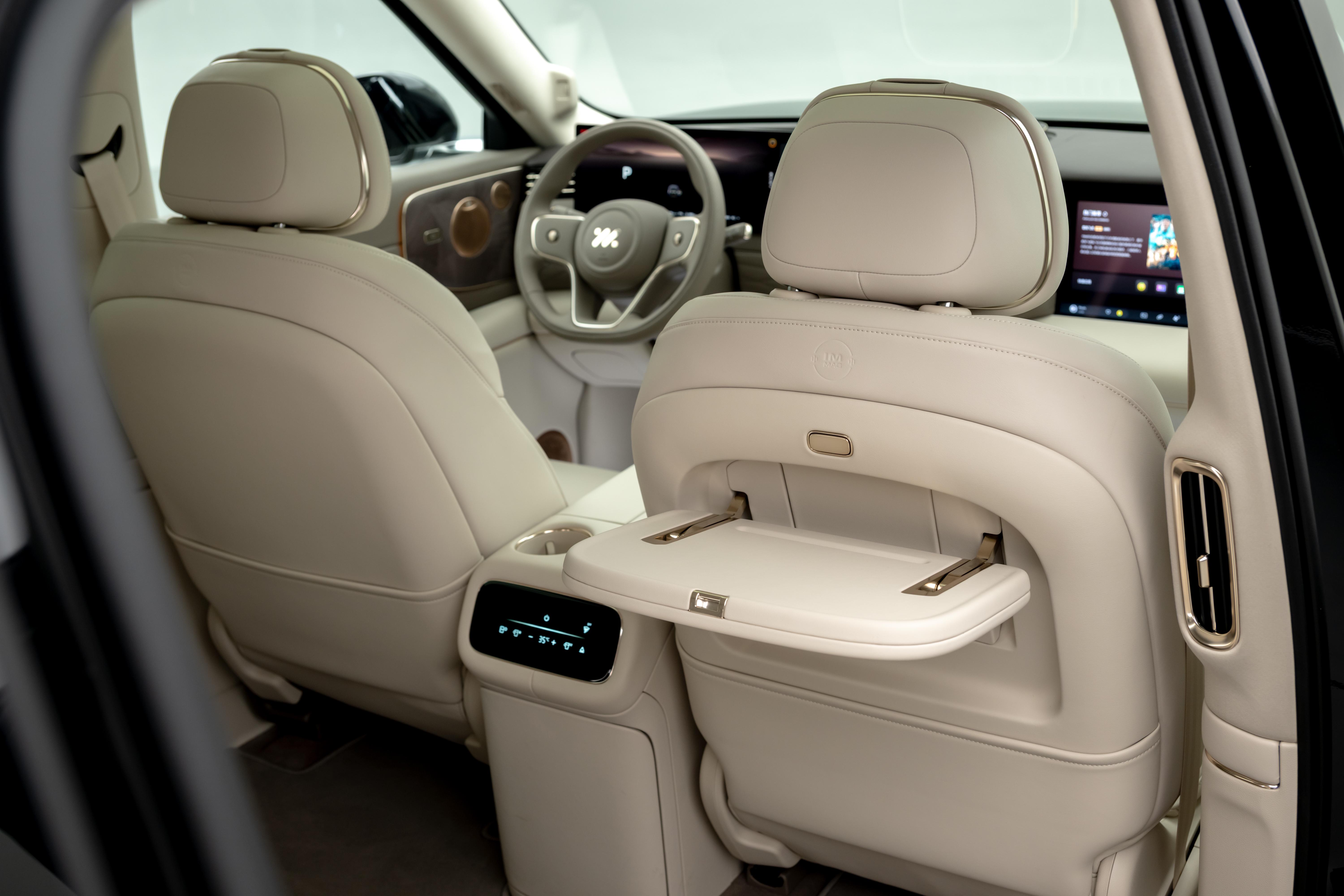整个座舱整体采用大量软性皮质包裹,配合门板的木纹饰板和多处金属条装饰,增加豪华质感。座椅采用IM NappaDELUXE头层真皮材质,很有沙发质感,并拥有副驾零重力座椅、二排双零重力座椅和超级大床房模式,以及主驾和右侧二排座椅支持4D机械按摩技术,拥有5种古法经络按摩手法,可随时进入舒适放松时间。