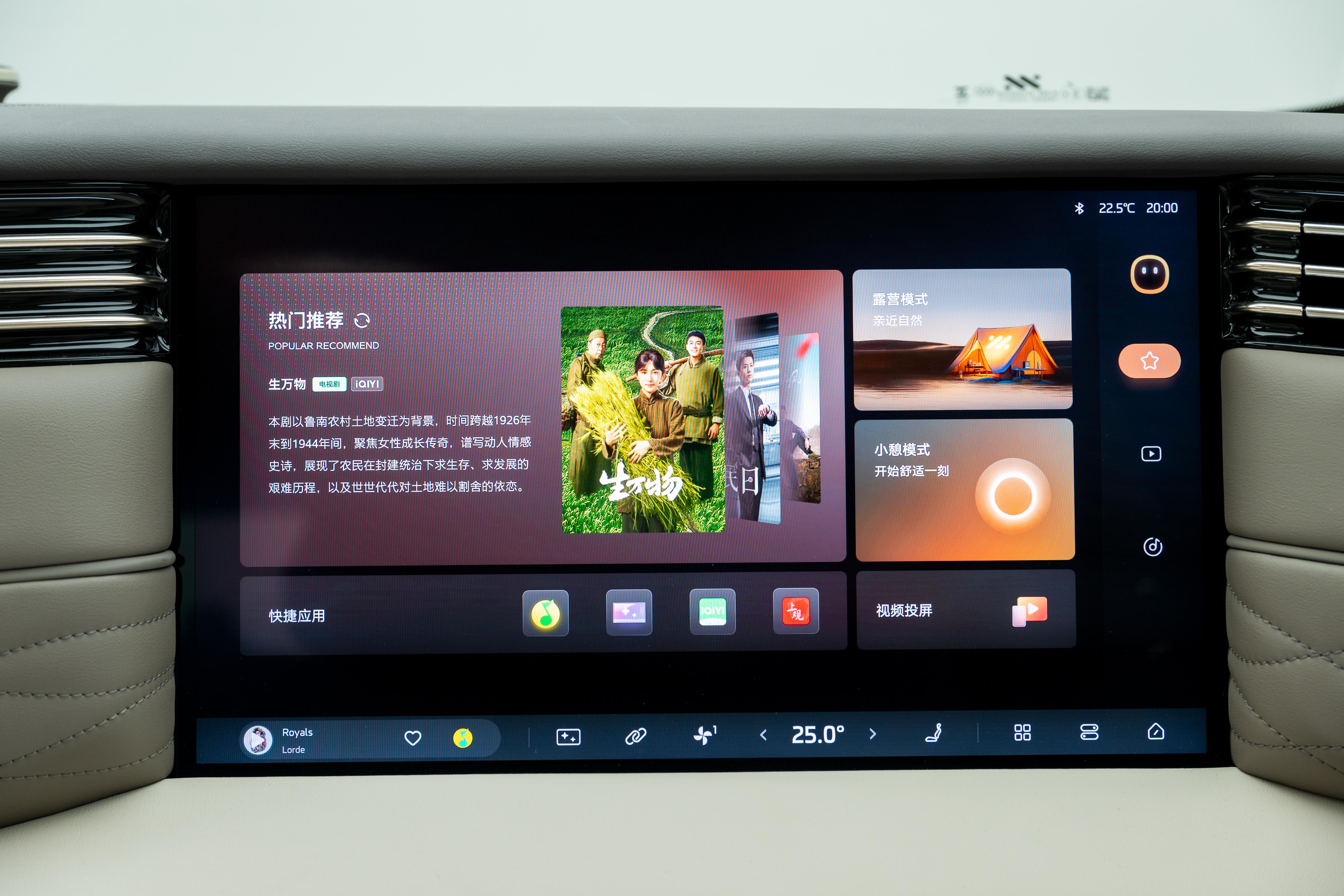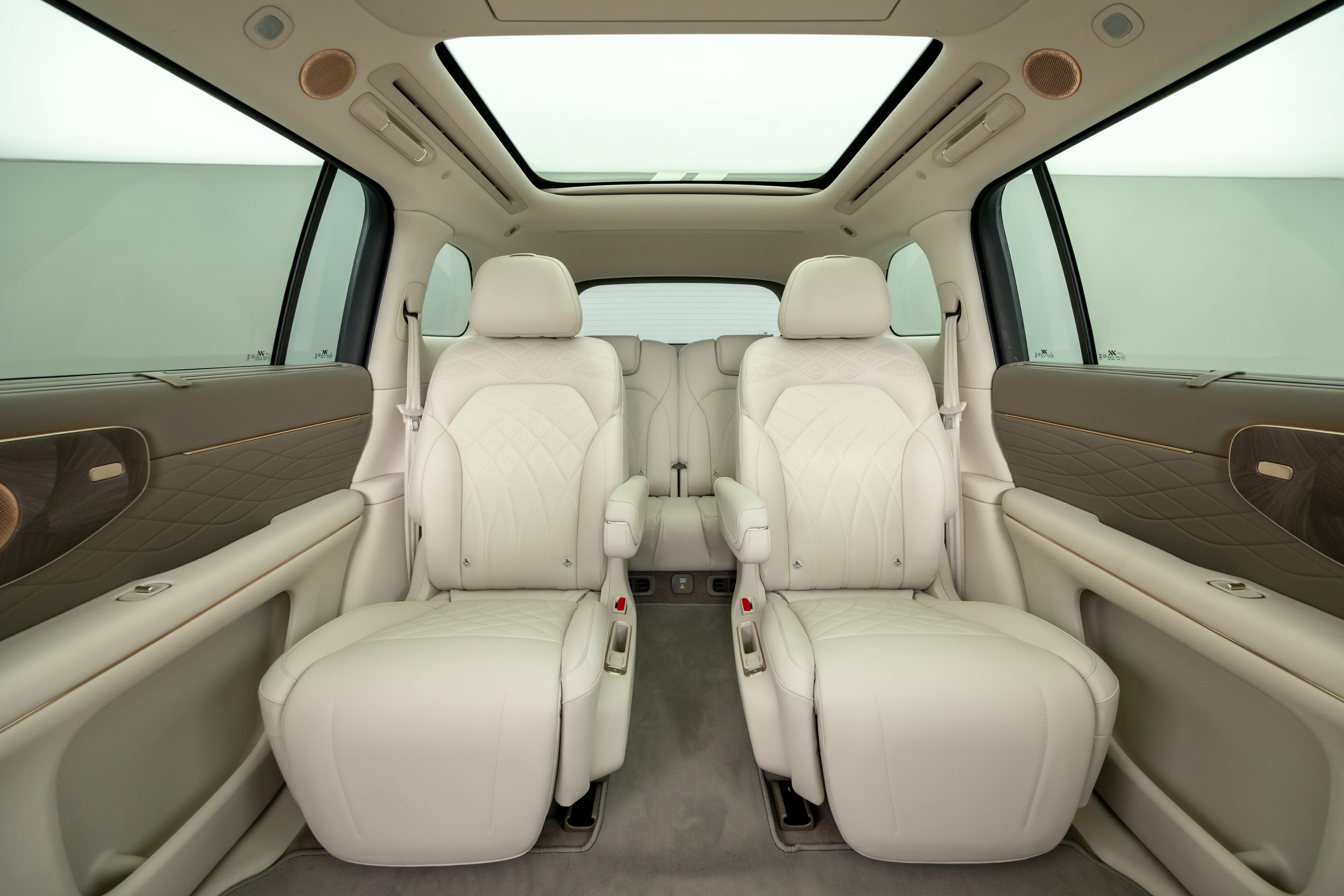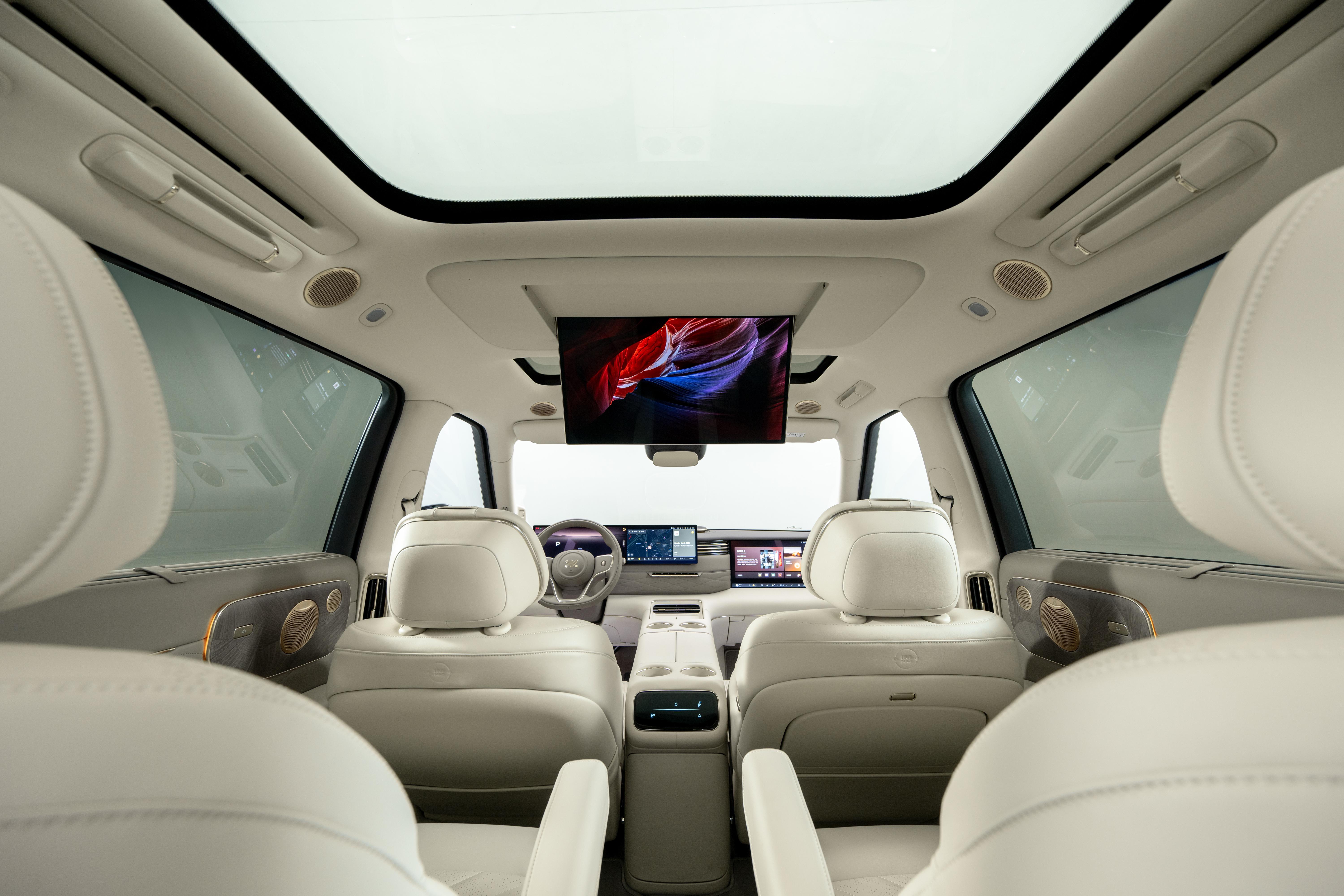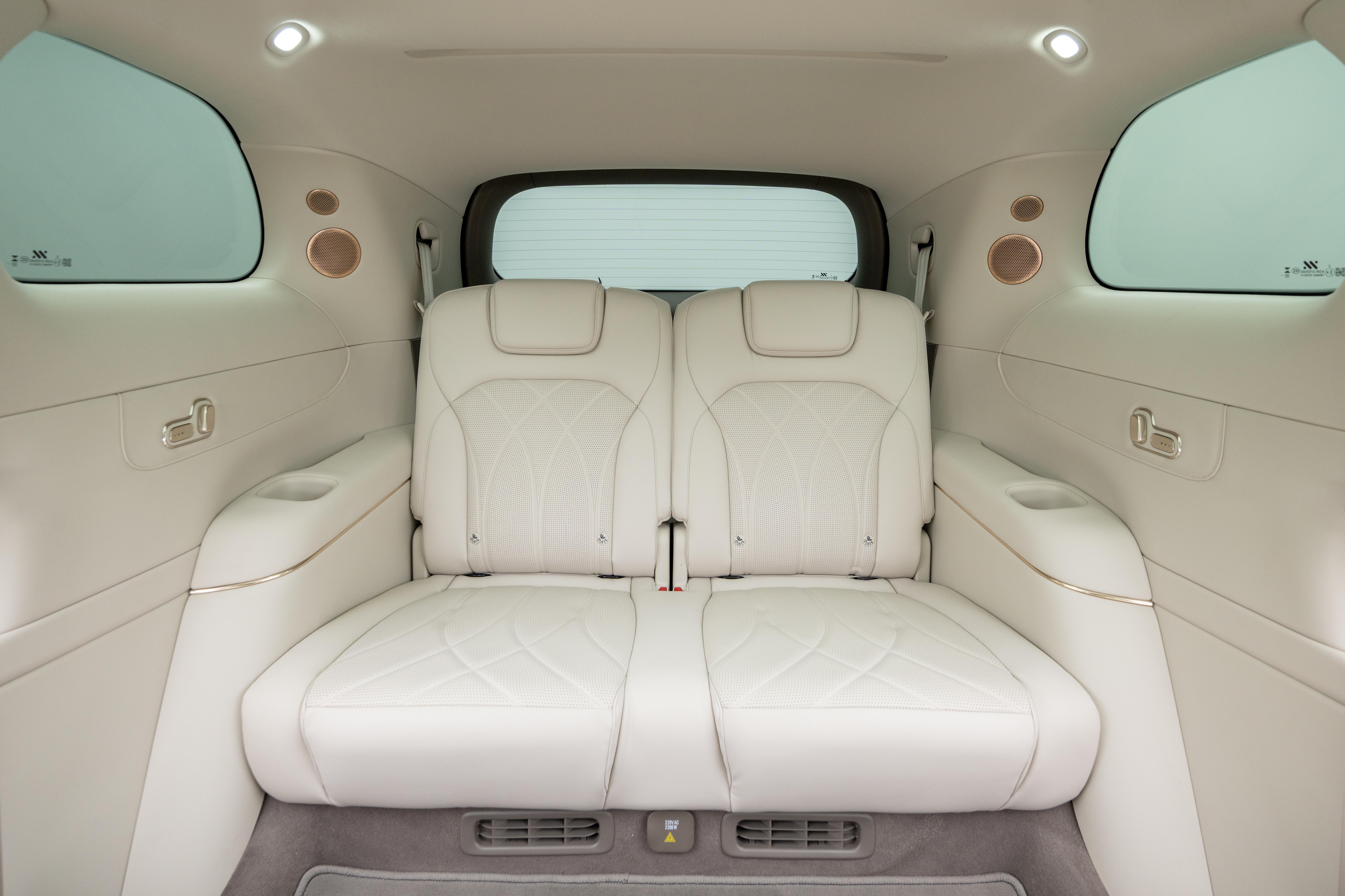 整个座舱整体采用大量软性皮质包裹,配合门板的木纹饰板和多处金属条装饰,增加豪华质感。座椅采用IM NappaDELUXE头层真皮材质,很有沙发质感,并拥有副驾零重力座椅、二排双零重力座椅和超级大床房模式,以及主驾和右侧二排座椅支持4D机械按摩技术,拥有5种古法经络按摩手法,可随时进入舒适放松时间。