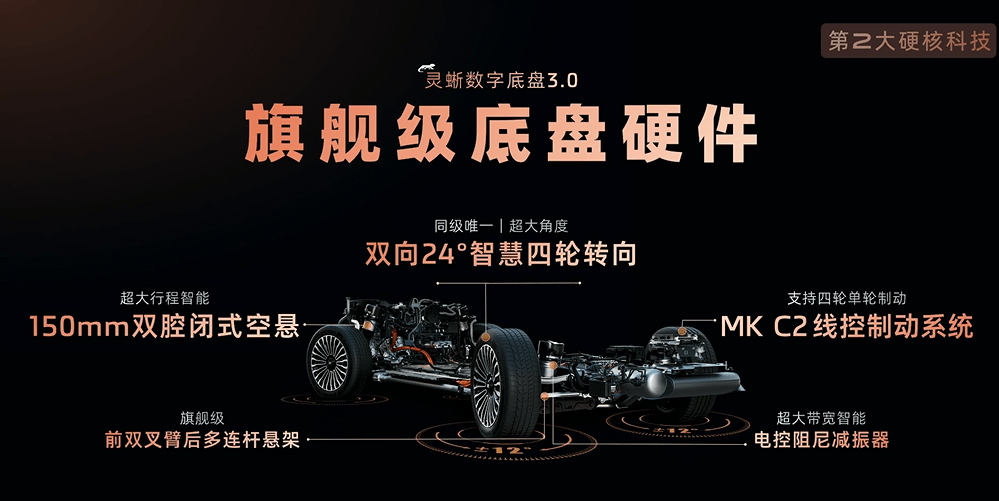 智己LS9搭载灵蜥数字底盘3.0,采用双向24°超大角度智慧四轮转向和前双叉臂、后多连杆悬架和MK C2线控制动系统等硬件。