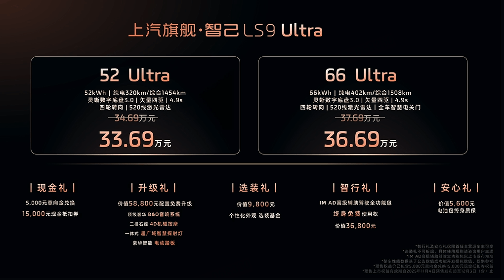 智己承诺,所有预订用户,于2025年11月25日(含)前完成锁单,若因智己原因无法在2025年内开票,享受购置税差额补贴,至高 15,000元。