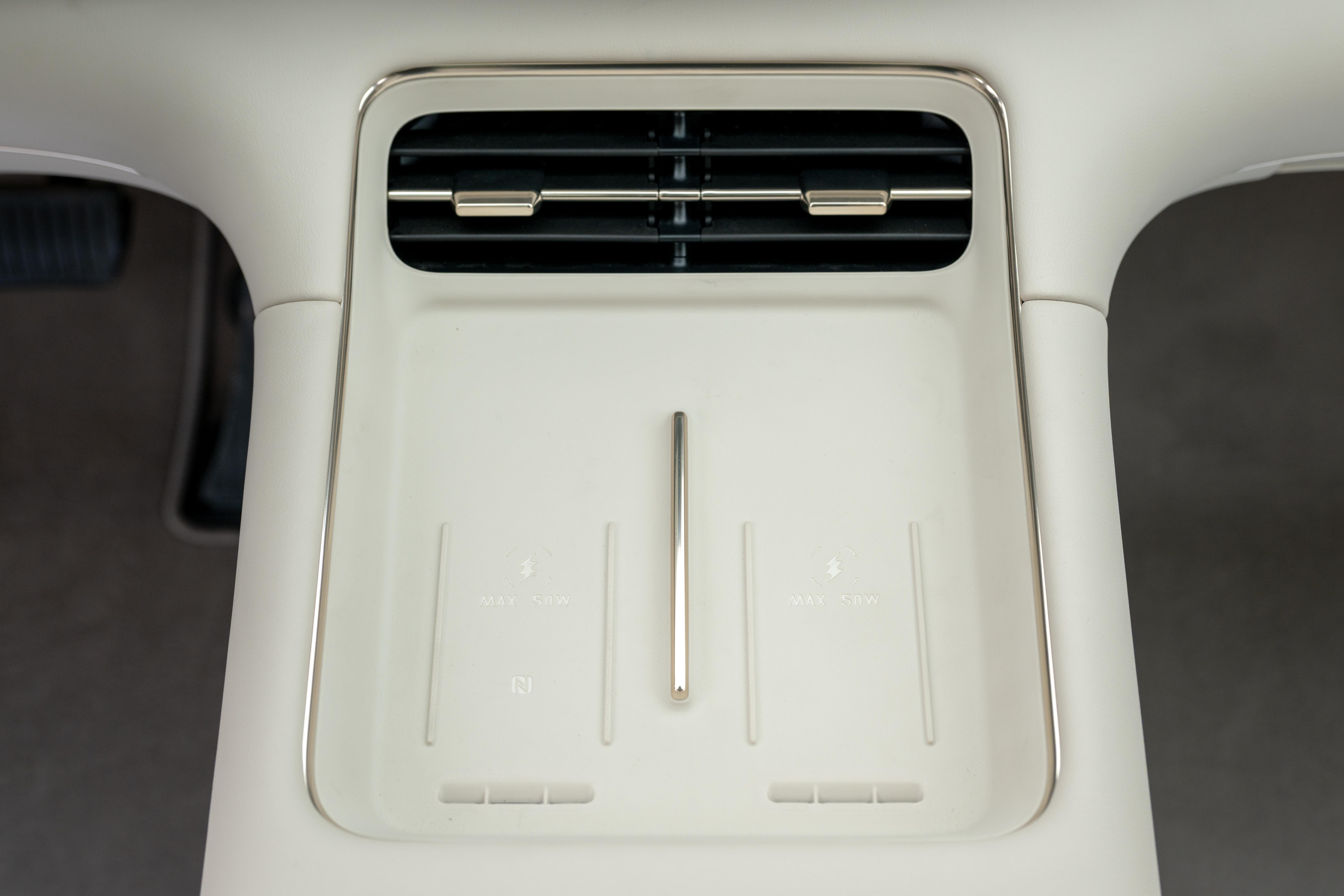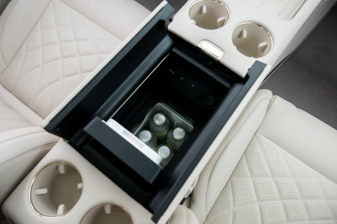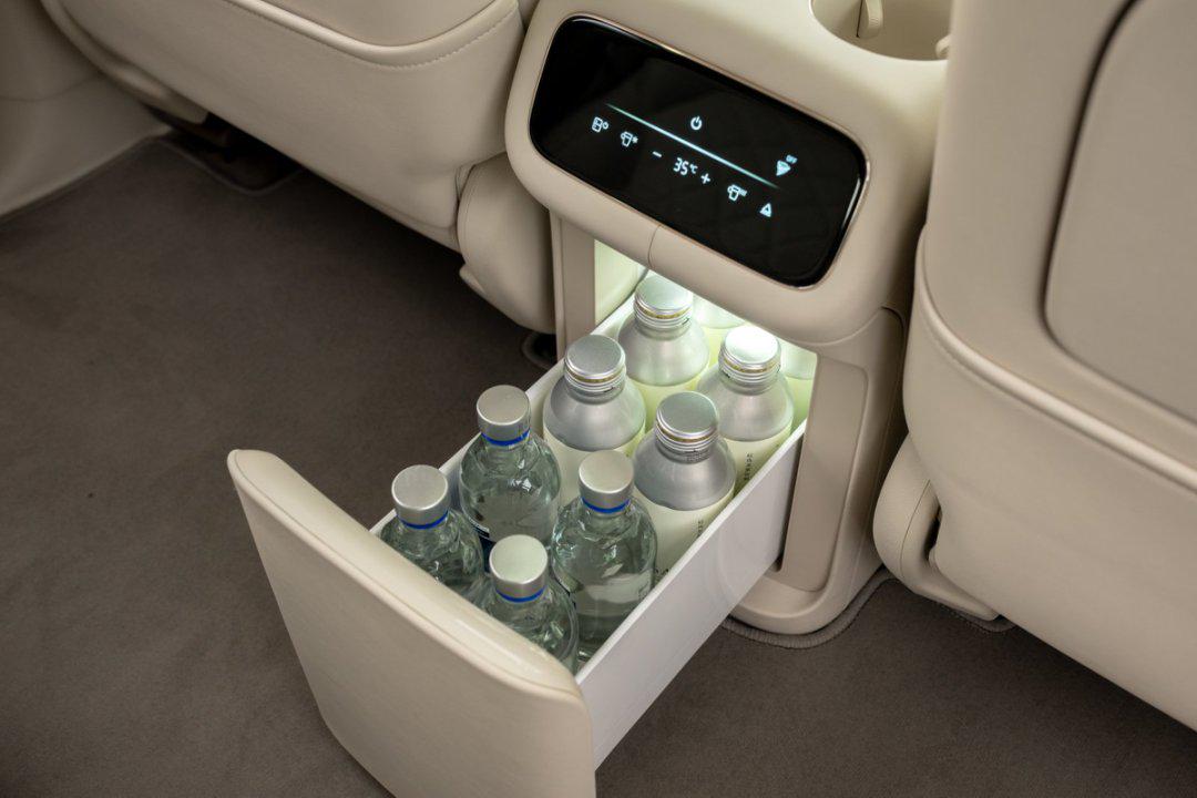 内饰方面,新车搭载三辐式方向盘,匹配27.1英寸5K驾舱屏,仪表盘和中控屏采用连屏设计,15.6英寸3K副驾娱乐屏则为内嵌处理,中控岛台设有无线充电面板和前后四个杯托,还有12L双开门冷暖车载冰箱,方便前后排驾乘人员同时取物,中央扶手后方配有控制屏。