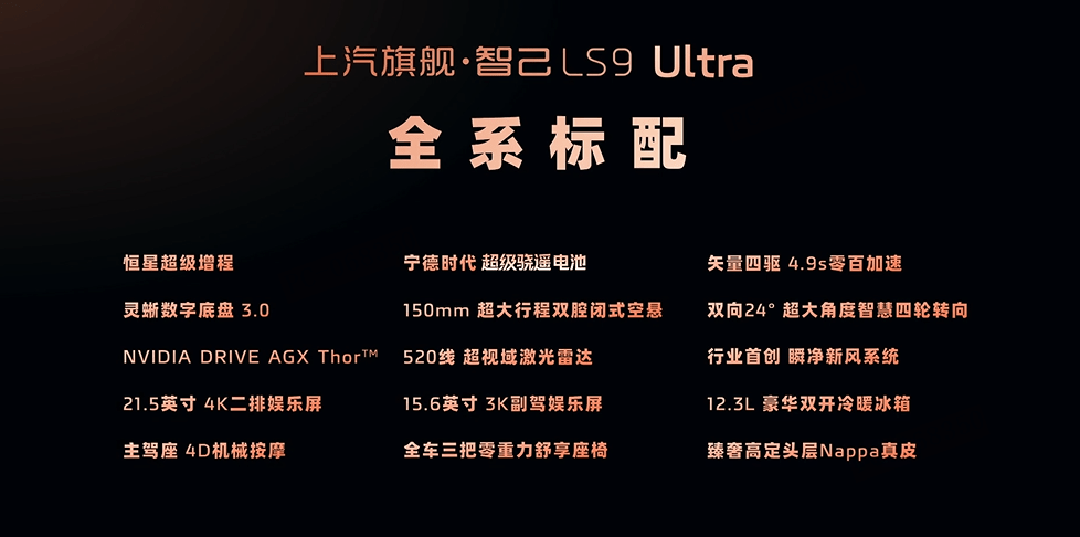 新车是上汽近十年技术创新的集大成者,搭载恒星超级增程,拥有402kmCLTC纯电续航里程、2.81L/100km的油电综合折算能耗、全系4秒级零百加速。驾控方面,新车搭载灵蜥数字底盘3.0,采用双向24°超大角度智慧四轮转向系统,官方称其为“最好开的9系”。同时,智己LS9全系标配520线激光雷达和ThorU芯片,感知能力强大。此外,新车还搭载了IMAIOS智能座舱、丹麦B&O音响、4D机械按摩座椅等配置,预计在11月12日正式上市。