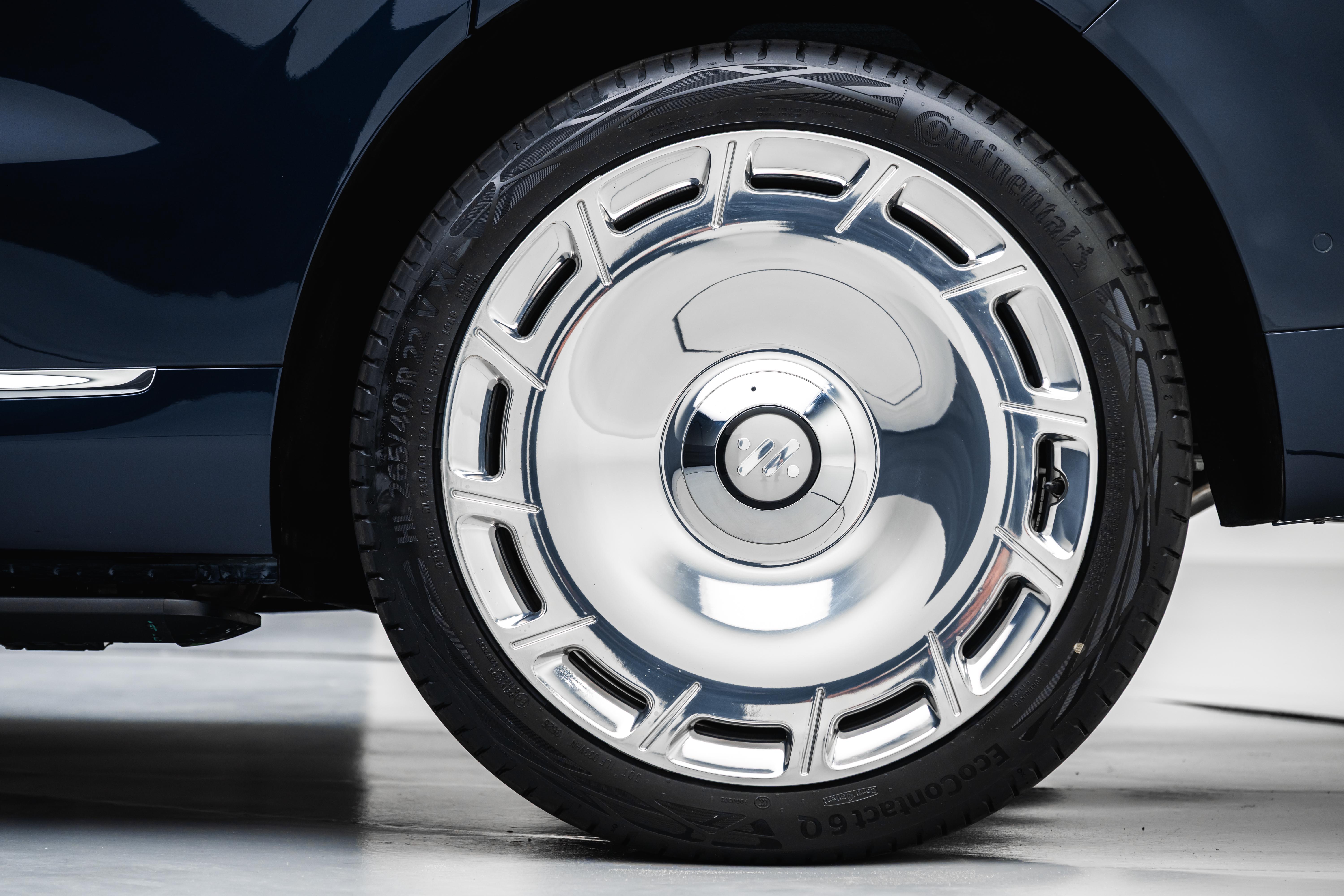 车身侧面忠泰策略,也是方方正正的设计。内凹式的腹线和贯穿式的肩线,更显气场。侧窗下方为银色镀铬条装饰,搭配悬浮式车顶和隐藏式门把手,显得高大威猛。轮毂为圆饼式造型,共提供20英寸、21英寸、22英寸三种轮毂尺寸。